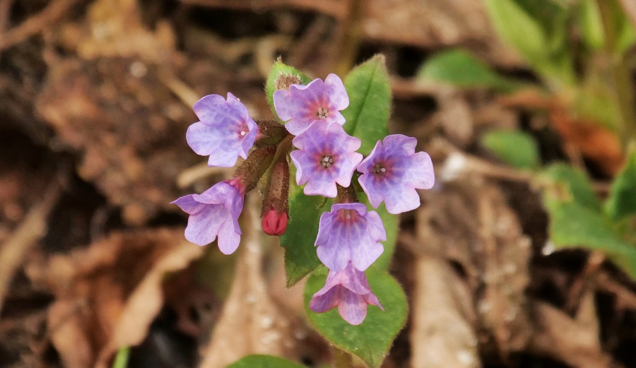 „Nach der ungewöhnlich langen Phase von Kälte und Schnee erfreuen die ersten Spaziergänge im Vorfrühling umso mehr. Gespanntes Ausschauhalten nach den ersten Frühblühern… doch sind es nicht so die üblichen Krokusse oder Schneeglöckchen, die man allerorts erwarten kann. Welche im Jahr frühen, aber versteckter auftretenden Blühpflanzen lassen sich noch erblicken? Und dann, am Waldesrand an einem sumpfigen Wasserlauf, ist es zum Glück noch nicht verschwunden: mit zart blau/violetten Blüten zeigen sich einige Exemplare des Lungenkrauts in der Sonne. Wie der Name schon sagt, ist es ein von Alters her bekanntes Heilkraut bei Erkrankung der Atemorgane. Es hier noch entdecken zu können, ist schon für sich eine Bereicherung der heutigen Wanderung im März.“