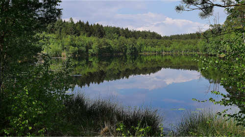 Man kann aber auch vorher schon über einen sehr reizvoll angelegten Bohlenweg direkt durch die Wiesen in Richtung Westen über den Hellbach laufen. Am Hellbach am besten die Atmosphäre dieses naturnahen Gewässers genießen. Wo bleibt der Eisvogel? Auf der Westseite kann man in Richtung Norden die Runde um das Hellbachtal fortsetzen. Ein anderes Waldbild – stattliche Buchen aber auch dunkle Fichten – sorgt wieder für einen ganz anderen Eindruck. Auf dem weiteren Weg ergeben sich noch andere Möglichkeiten, den Hellbach wieder zu queren. Die relative Abgeschiedenheit und tendenziell nicht so sehr hohe Besucherfrequenz laden zum Genuss und Verweilen ein. Mit etwas Glück ermöglichen sich Tier- und Vogelbeobachtungen entlang der offenen Blickachsen ins Tal, denn auch die Tiere mögen es ungestört. Bitte bleiben Sie bei Ihrem Besuch auf den Wegen und hinterlassen keinen Müll.