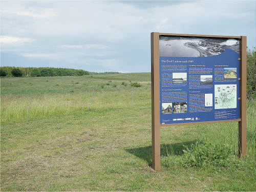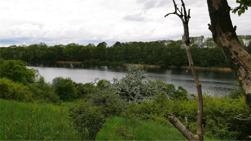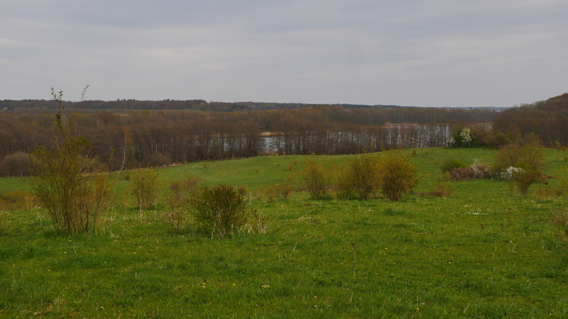 Nach einer Weile kann man nach links abknicken, um das „Geisterdorf“ Lankow zu erreichen. Wie an vielen anderen Orten auch, wurden im Zuge des „Grenzausbaus“ durch die DDR und zur Schaffung freier Sichtachsen die Menschen von hier zwangsumgesiedelt und das Dorf schließlich geschleift. Um 1976 wurden die Gebäude abgerissen und das Dorf dem Erdboden gleichgemacht. Gedenktafeln mit Fotos der einstigen Gebäude erinnern an diese Tragödie und hier und dort lassen sich noch die Bodenplatten der früheren Häuser finden. Eine besondere Stimmung empfängt einen, wenn man an diesem Ort dem einstmaligen Dorfleben nachspürt… Die Umgebung lädt darüber hinaus ein weiteres Mal dazu ein, sich auf die Lauer nach Braunkehlchen, Grauammern, Neuntötern und Grasmücken zu machen, und mit etwas Glück macht auch der Pirol auf sich aufmerksam. Nach der Wüstung kann der Besucher entweder zum Seeufer zurück und sich nach Südosten wenden oder über einen Schlenker durch das offene Grasland die gleiche Richtung einschlagen. Der nächste, ebenfalls spannende Wegabschnitt berührt wieder das bewaldete Seeufer und nach Norden Wiesen und Felder. An einem Naturschutzschild knickt der „Weg“ nach rechts; es geht jetzt in Richtung Süden durch sehr uriges Gebiet über einen etwas unbequemen, da von Wildschweinen durchpflügten, Pfad wieder auf schleswig-holsteinisches Territorium. Der restliche Weg führt über einen Redder in Richtung Mustin und zur B208. Über einen Schlenker durch Mustin kann bei passenden Öffnungszeiten die Wanderung mit einem Besuch im schönen Waldcafé belohnt werden. Ansonsten gilt es, tapfer die letzten Kilometer entlang der Bundesstraße zurück zum Parkplatz zu bewältigen.